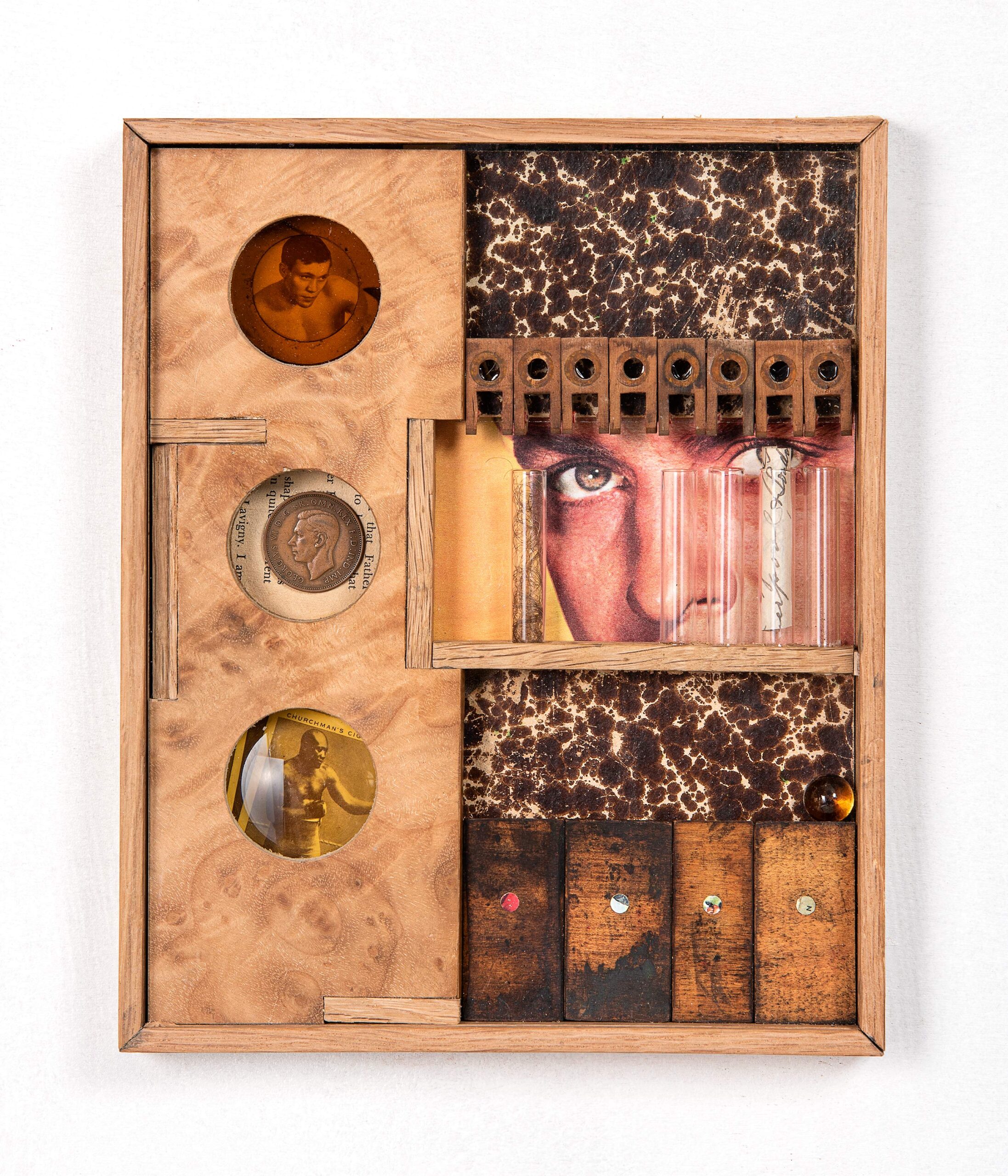 Made from recycled Oak, museum glass, old book covers and collage. This intricate box construction measures 19cm x 23cm x 3cm.