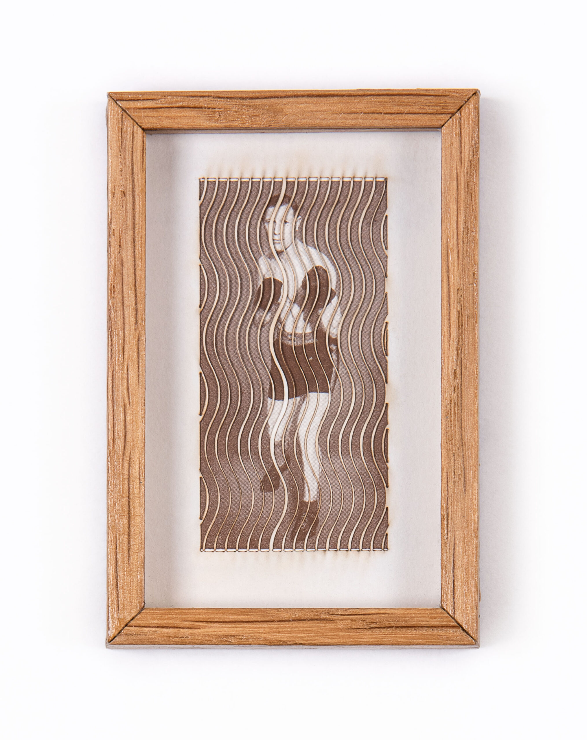 This small box construction is made from recycled oak, museum glass and features an image from a set of cigarette cards of boxing personalities. Slightly obscuring it is a laser cut cigarette card. Measuring 60mm x 90mm x 17mm it exemplifies the miniature, fitting perfectly in the palm of your hand. An ideal gift for any art lover.