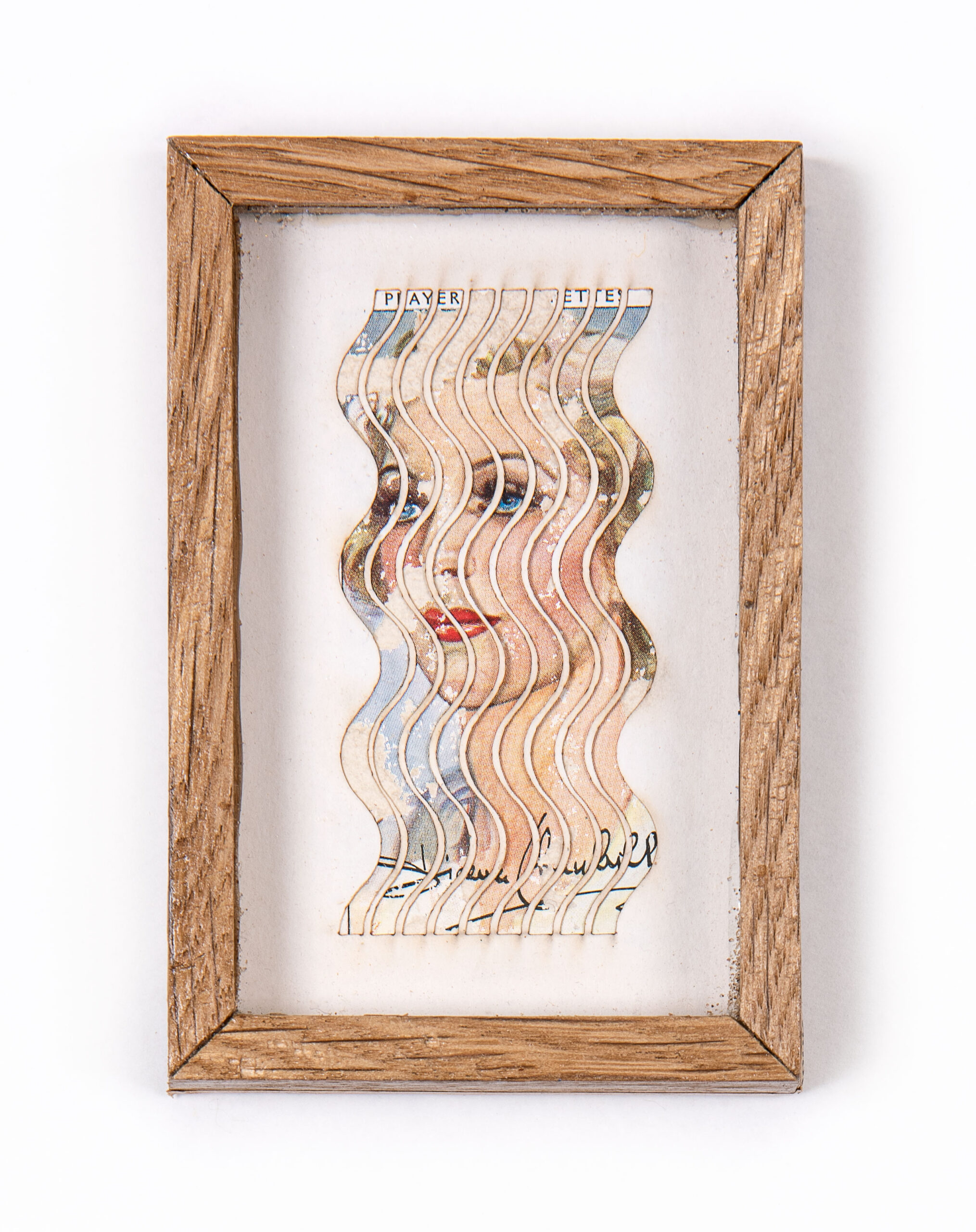 This small box construction is made from recycled walnut wood, museum glass and features a collage created from vintage cigarette cards. Measuring 60mm x 90mm x 17mm it exemplifies the miniature, fitting perfectly in the palm of your hand.  An ideal gift for any art lover.